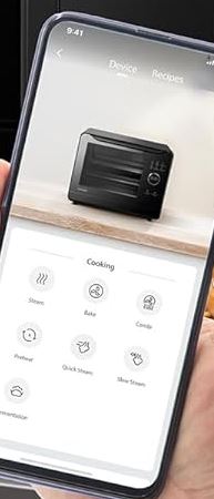 This is the Toshiba 7-in-1 Steam Oven: an app connected countertop oven with multiple programs to cook your food just how you like. It has 36 preset menus to get started faster. You can start a program through the app to have the temperature and time automatically adjusted. This model has up to 1900W output (steam baking mode).