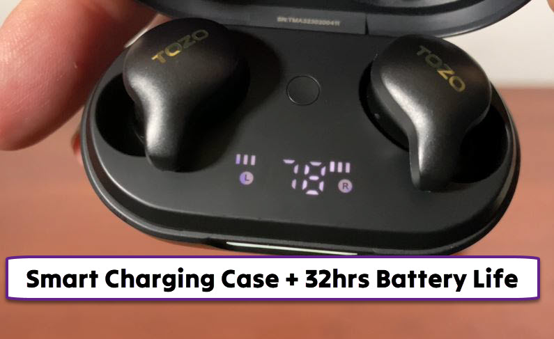 Our TOZO Golden X1 earphones shipped in a very compact package. We got a total of 6 ear tips, a smart charging case, manuals, 2 wireless buds, and a short USB-C charging cable. The charging case features a digital LED display for checking the charging status without needing to use your phone.