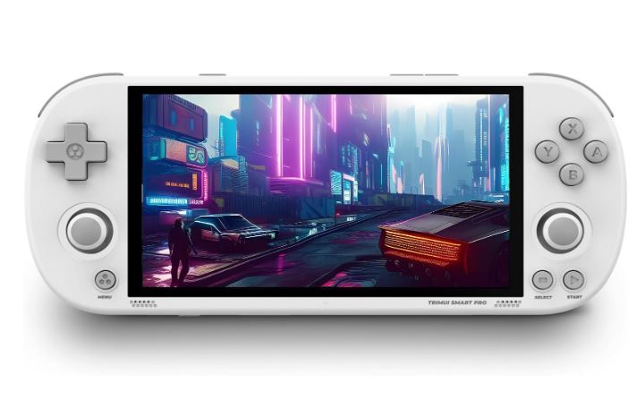 This is the Trimui Smart Pro: a 5-inch handheld gaming device with 720p resolution that lets you play thousands of retro games on the go. It has over 26 built-in emulators ready to go out of the box. It comes with a quad-core 1.8GHz processor with a PowerVR GE8300 graphics.