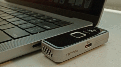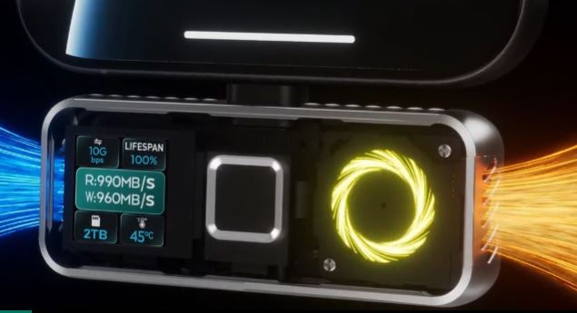 This SSD offers transfer speeds up to 1000MB/s. It also has a cooling fan to prevent overheating. Twopan Pro SSD has a USB-C and DP 1.4 video output. It has a magnetic design, so you can stick it to the back of your phone with peace of mind. You can use this with your PS5, iPhone, Android devices, and AR glasses. Twopan Pro has a 0.85inch LCD display that shows the real-time temperature of the drive. You can also monitor transfer speed, voltage, and power.