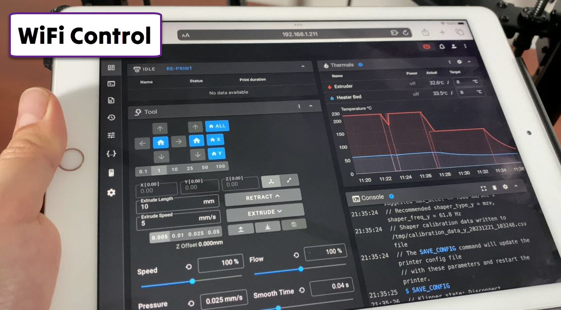 The SK1 printer is equipped with Ethernet, USB 2.0, and USB 3.0 ports on the side. Through the touchscreen display, you can change various settings, including fan speed, language, and screen brightness. You can also turn the light on/off, load filament, and access your 3D models. More advanced users can make further adjustments for complex prints.