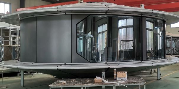 Here is another cool tiny mobile house that turns heads. The Libra UFO Mobile Home looks like a parked spaceship. It gives you a great view of the outside but also has a kitchen and bathroom It also has gorgeous lights all around for nighttime. It also has automatic doors.