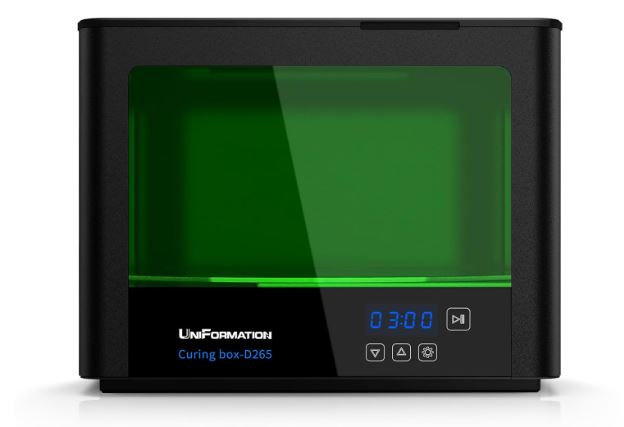3D printing models using resin can be fun but you need to cure them with the appropriate UV wavelength and heat to turn them more solid and stable. The UniFormation Curing Box D265 can help. It uses 16 UV lights (405nm UV) and a rotating turntable to provide 360-degree coverage of models for curing.