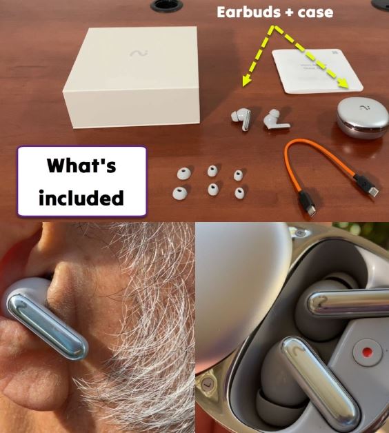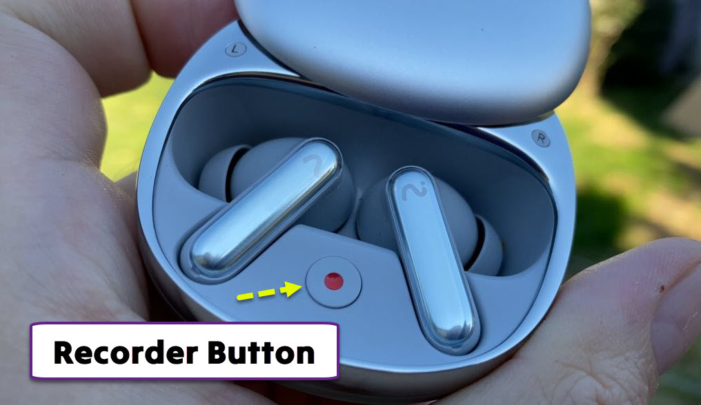Our RecDot shipped in a very compact package. The silver version we received looks very sleek right out of the box, but there is a black version available too. These earbuds ship with 4 pairs of soft eartips (XS, S, M, L) as well as a USB-C charging cable. The first thing we noticed when opening the charging case was the FlashRecord button. This is the feature that lets you use your earbuds to record a meeting while they are in the case. You also have the option to press one of the sensors on them to record your calls.