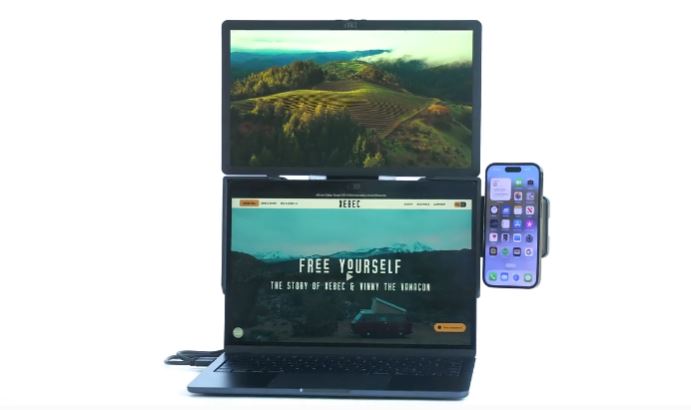 This is the Xebec Snap: a cool portable monitor setup that lets you attach an additional display, light and phone charger to your laptop. It has a 13.3-inch display with full HD resolution. You also get a MagSafe charger for your phone and a light with an adjustable color temperature. The bracket can be attached to laptops from 13 to 17.5 inches.