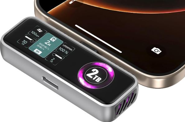 These drives could get warm after prolonged use, which leads to performance degradation. This SSD has a built-in fan to stay cool. It also has a PD 3.0 port for 27W charging. The Z791C SSD is compatible with iPhone 15 to 17. Its display shows transfer rate, voltage, temperature, and other settings. You can get this with up to 2TB capacity. It is fast enough to let you directly edit videos on it.